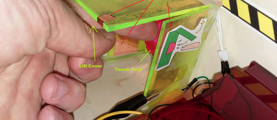 The game is themed around disarming a bomb, with all its components contained inside a box to simulate the opening of a bomb and the surprises of wires and other components waiting inside. After the player opens the “bomb” and starts up the project, they are prompted by a voice to cautiously press the correct buttons. Random lights will light up on the circuit board indicating that the corresponding button needs to be touched by the player to move to the next step of disarming the bomb. The player must follow the wires connected to the board closest to the lit-up light to the button it is attached to. Once the correct button is found and pressed, the light will turn off and add a point to the player’s successful rounds. The player will then be prompted by the lights to look for the next button. Once the player has 3 successful rounds, the bomb will be stopped, lights will turn blue, and a voice will congratulate the player. If the player touches a hazard, an alarm will sound, and the player will lose a try. Once the player fails a challenge 3 times, they will be prompted to evacuate and lose the game. The voice, lights, buttons, and hazards attached to numerous wires are made to evoke tension in the player and cause partial confusion as they work to disarm the bomb correctly.